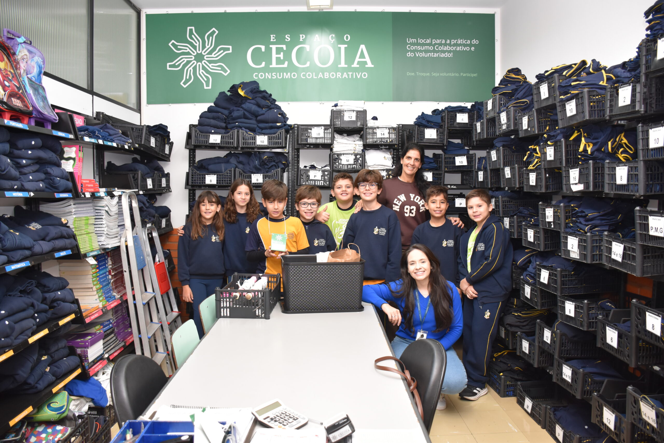 Promove o consumo colaborativo com itens escolares usados, com serviço voluntário de mães e alunos, mediante pagamentos simbólicos espontâneos destinados ao Centro Comunitário Irmão André.