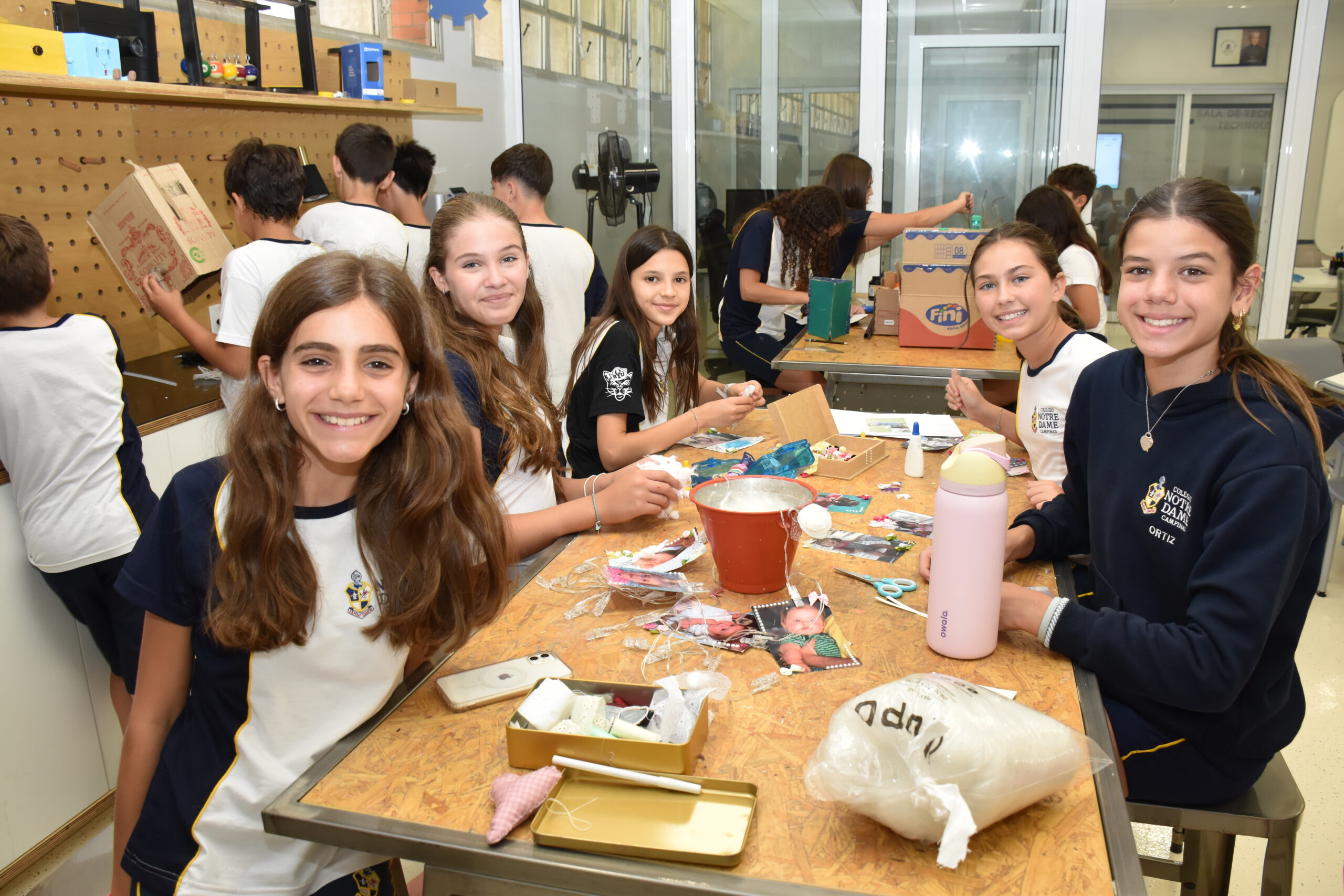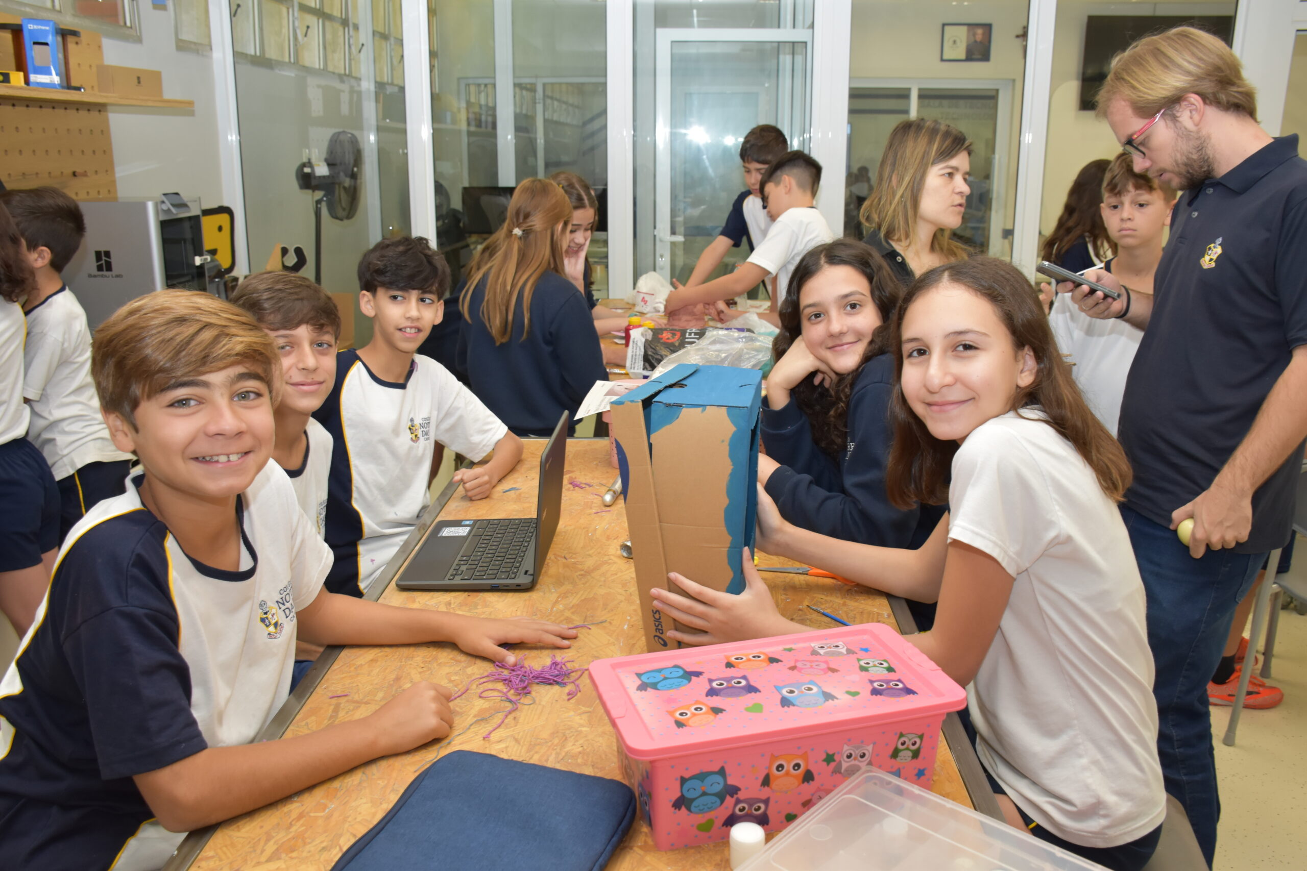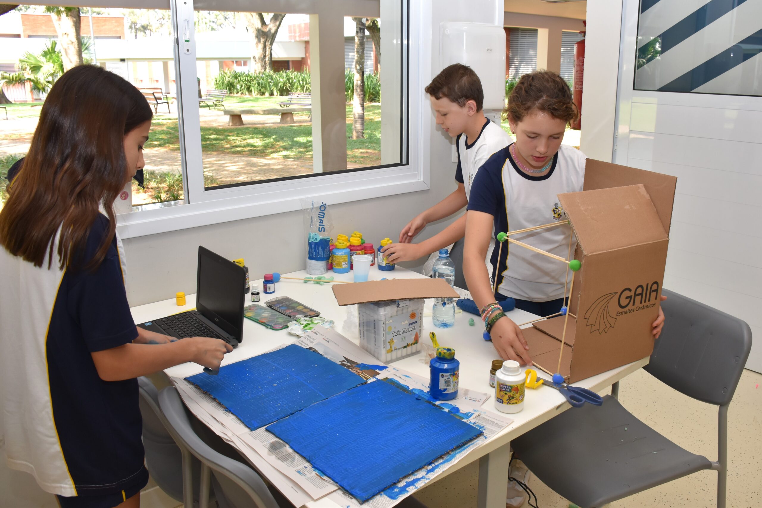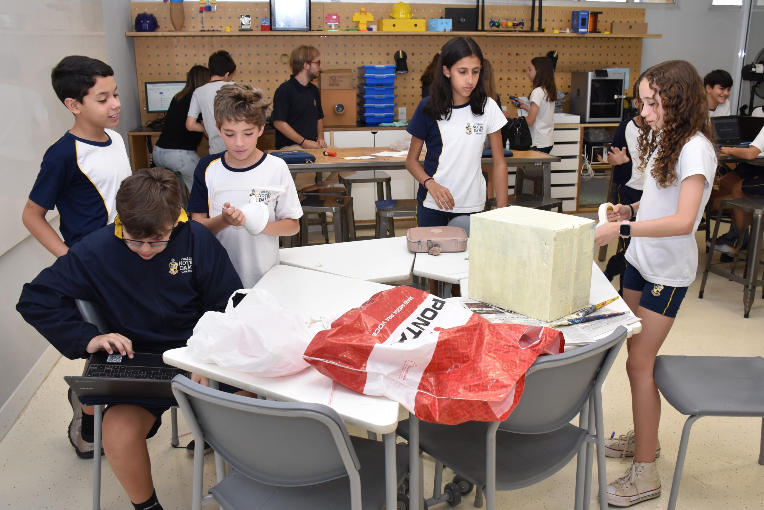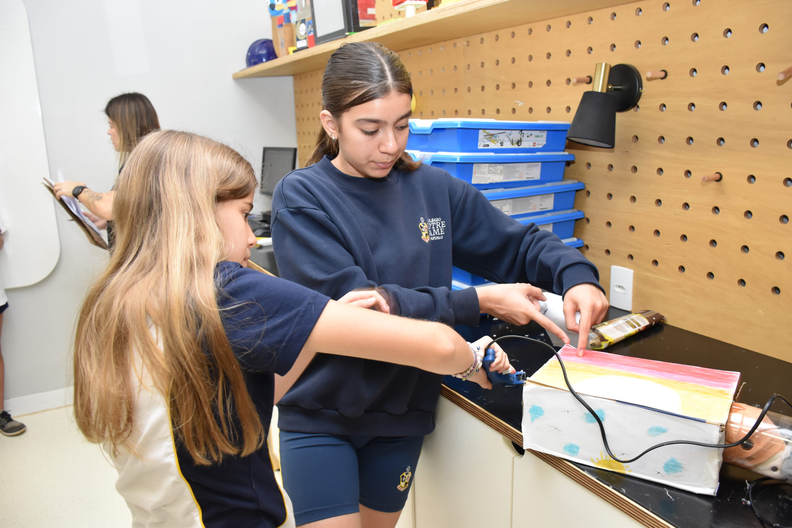 Para o trabalho, a Sala Maker foi usada, pois disponibiliza espaço e materiais adequados para pintura, colagem, cortes e montagens. As turmas se envolveram bastante e conseguiram concretizar algo mágico: a poesia.
