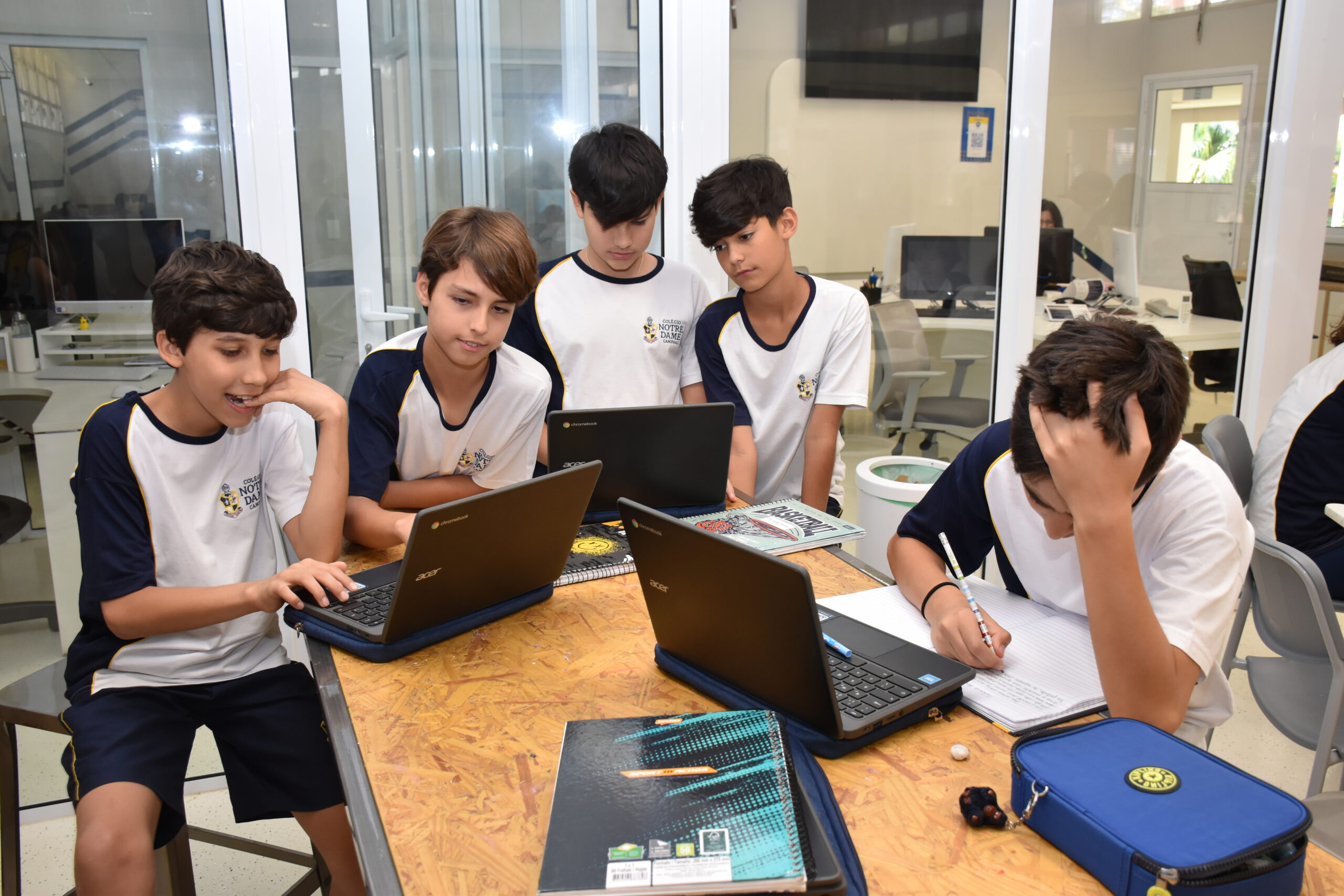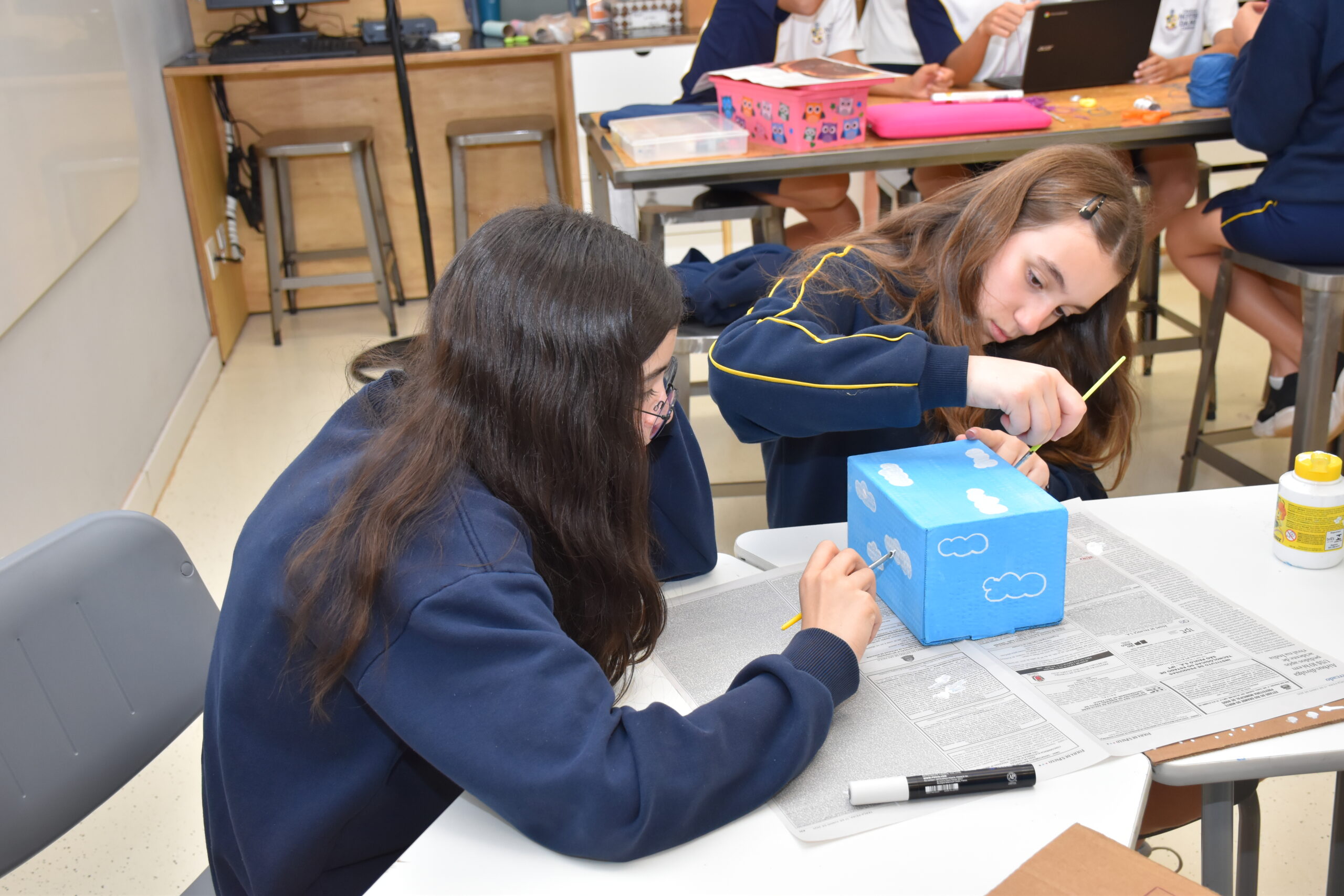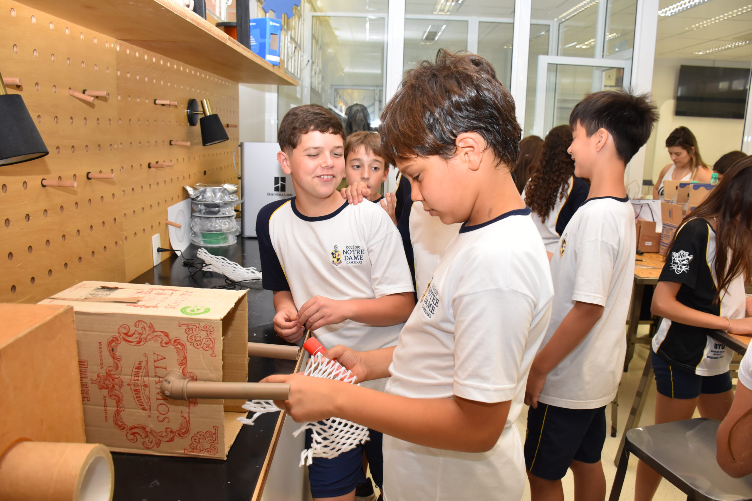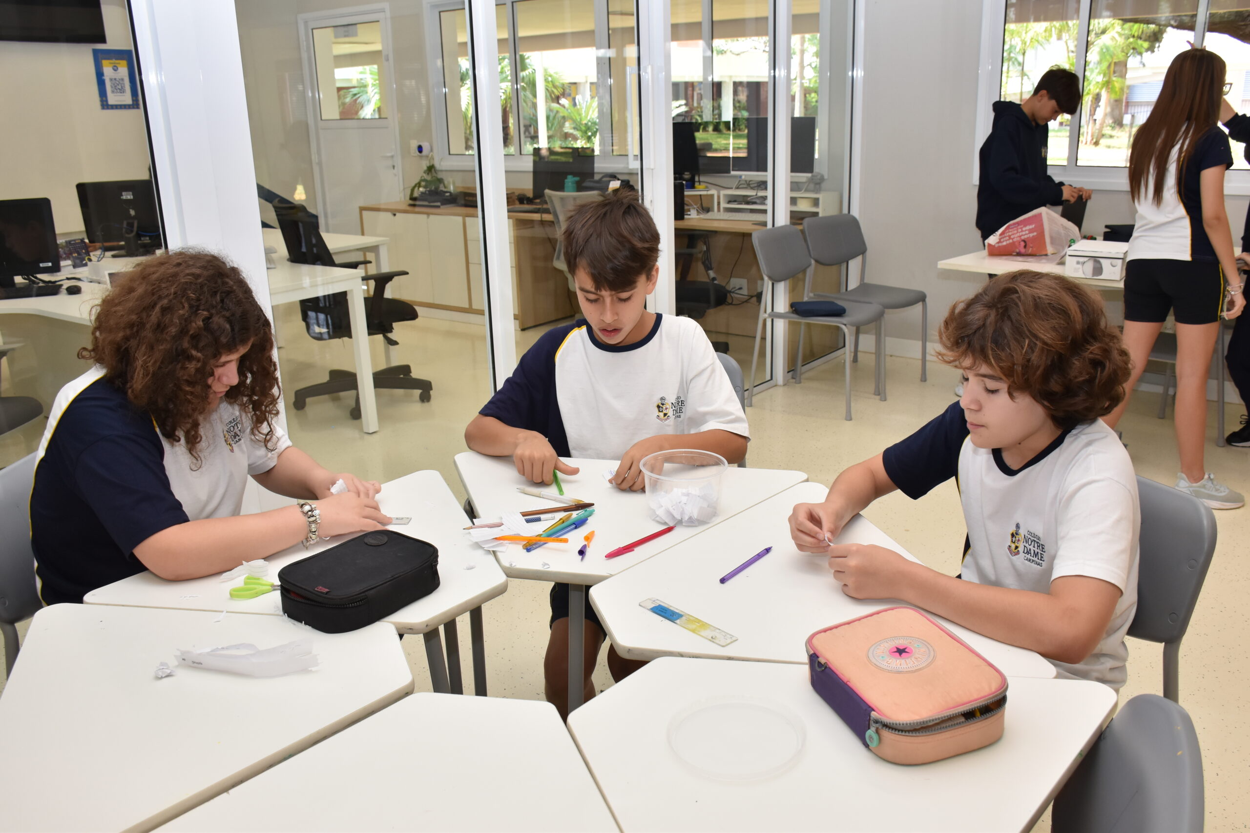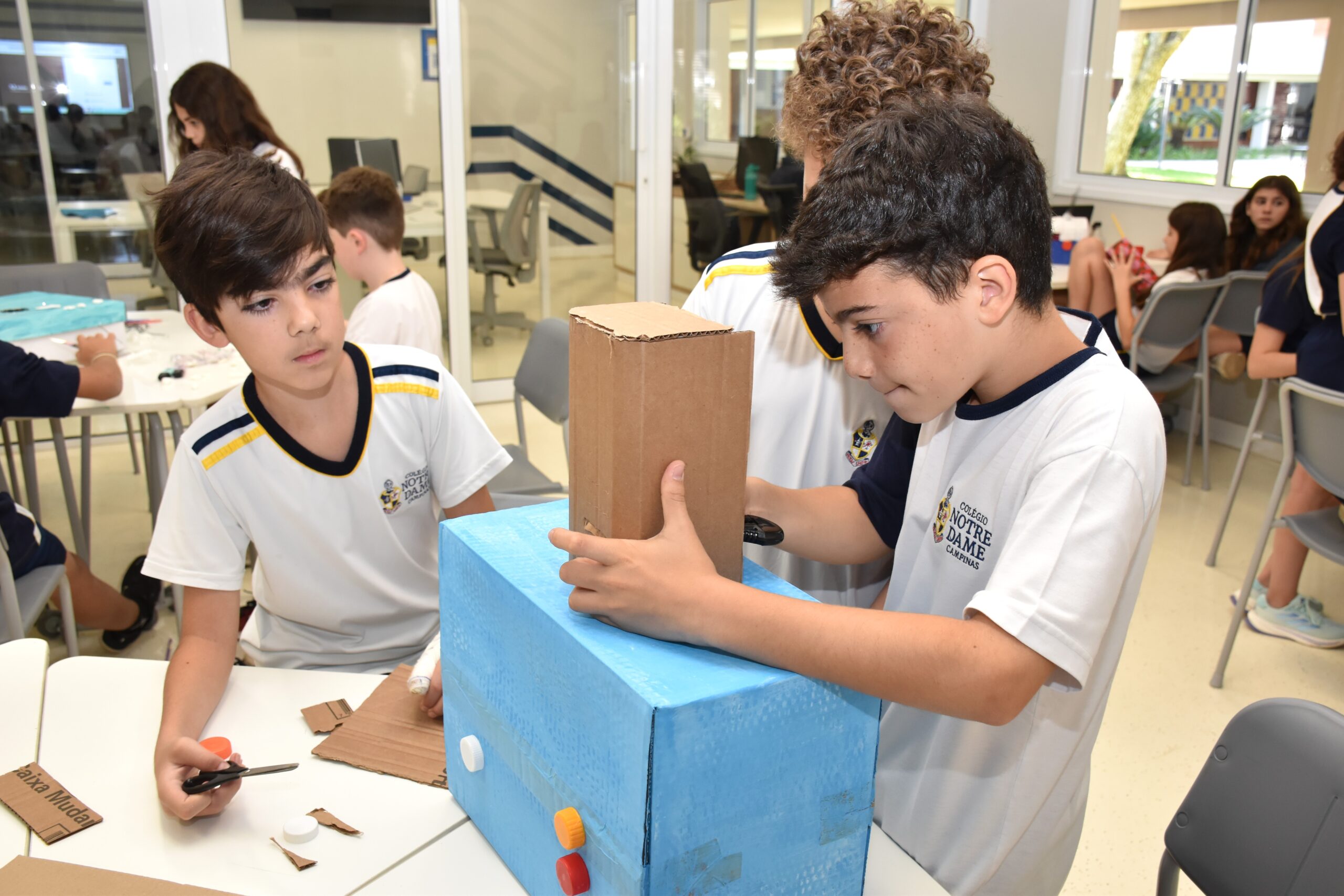 Para o trabalho, a Sala Maker foi usada, pois disponibiliza espaço e materiais adequados para pintura, colagem, cortes e montagens. As turmas se envolveram bastante e conseguiram concretizar algo mágico: a poesia.